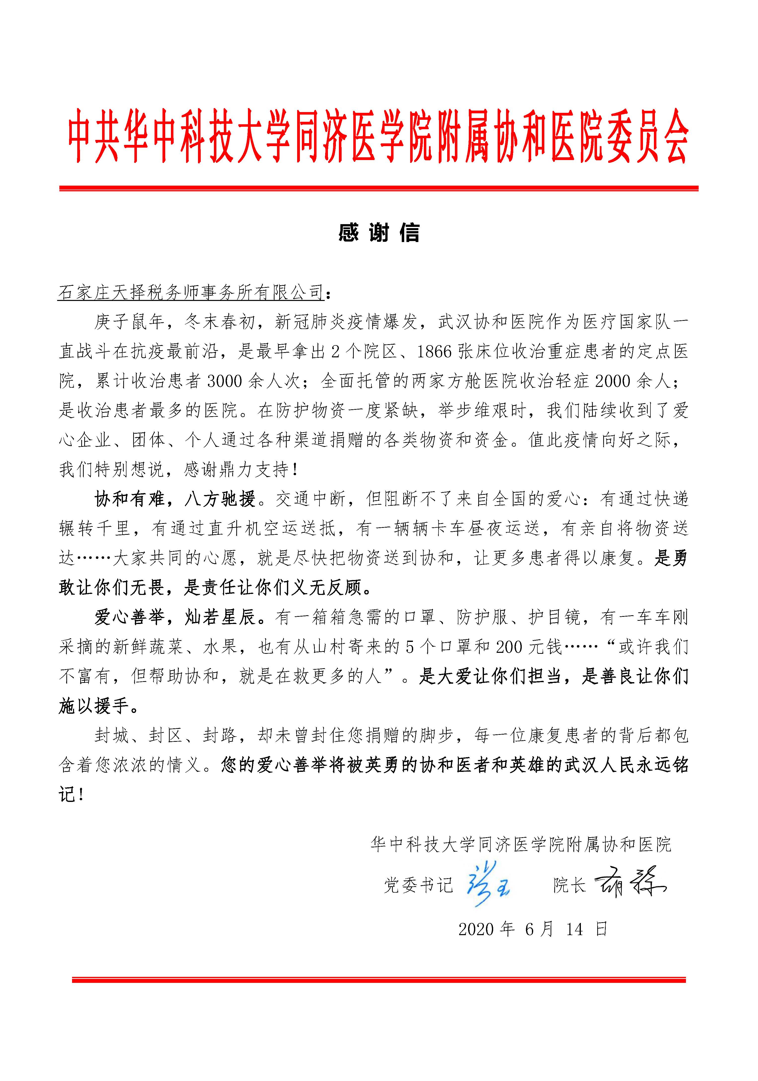中共華中科技大學(xué)同濟(jì)附屬協(xié)和醫(yī)院委員會(huì)感謝信