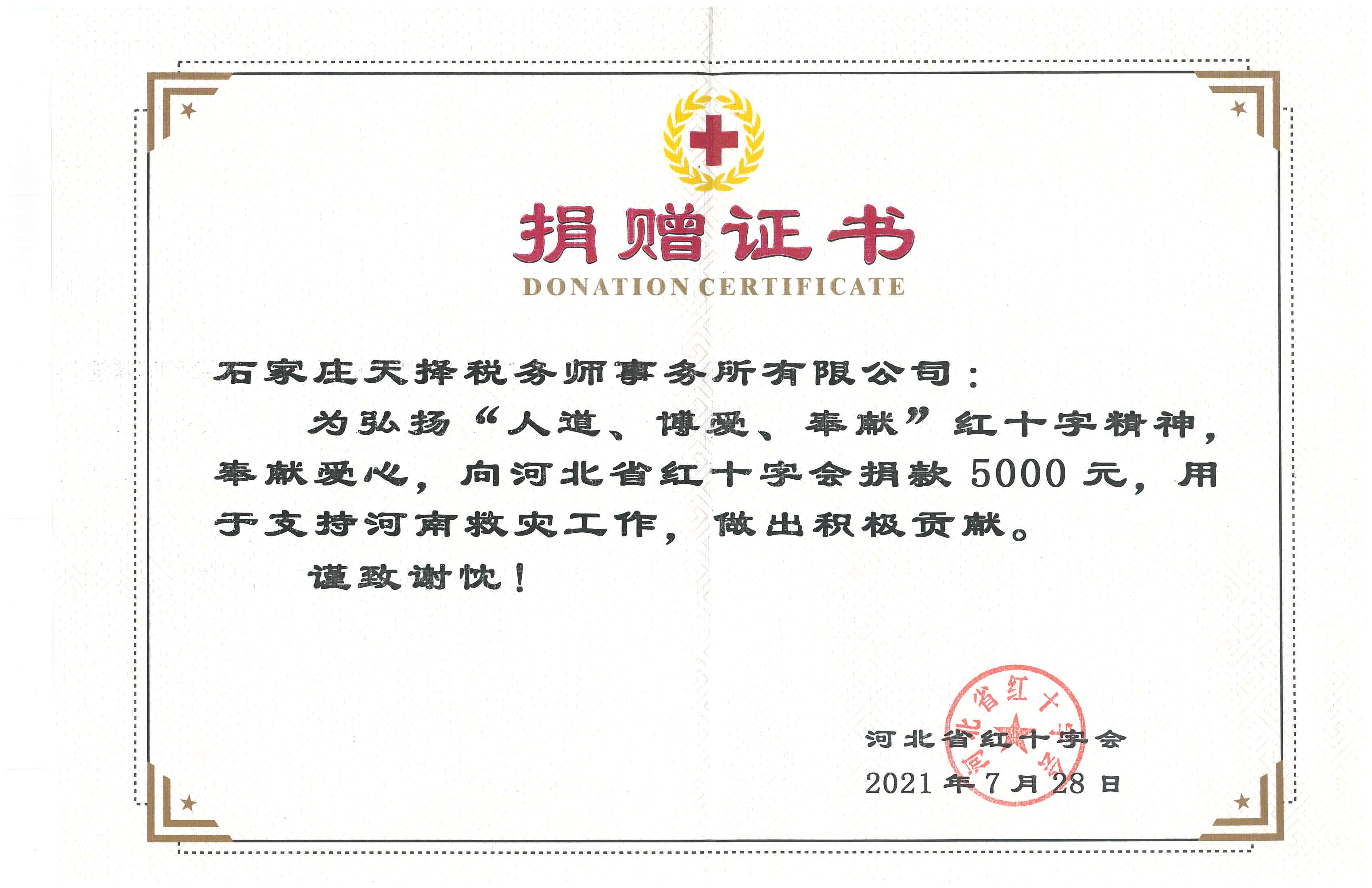 近日,河南省多地出現(xiàn)持續(xù)性、特大暴雨天氣,強(qiáng)降雨給鄭州、新鄉(xiāng)等地區(qū)造成了嚴(yán)重的財(cái)產(chǎn)損失。洪水無(wú)情,人間有愛(ài),一方有難,八方支援,石家莊天擇稅務(wù)師事務(wù)所積極響應(yīng)號(hào)召,向鄭州等地災(zāi)區(qū)捐款,用自己的愛(ài)心為災(zāi)區(qū)貢獻(xiàn)力量,以實(shí)際行動(dòng)踐行初心使命。