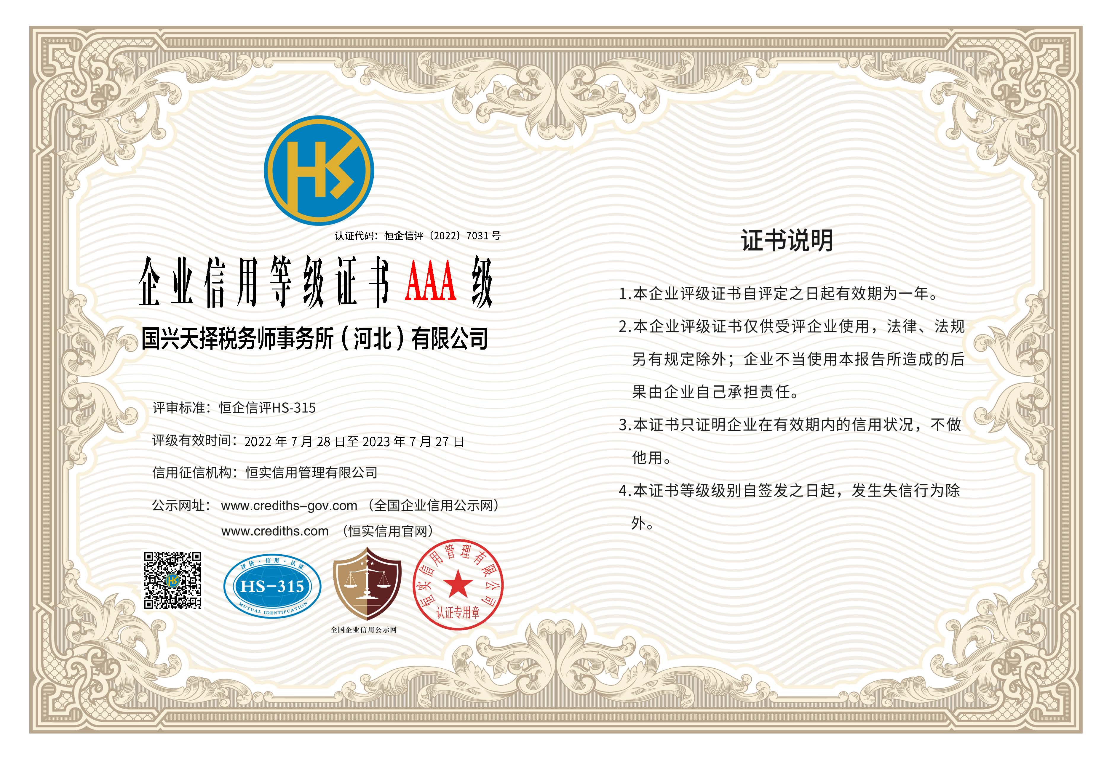 2022年7月,國興天擇稅務(wù)師事務(wù)所(河北)有限公司順利取得了“AAA級企業(yè)信用等級證書”。這標(biāo)志著我司在規(guī)范運(yùn)營、誠信經(jīng)營上得到了相關(guān)部門及權(quán)威機(jī)構(gòu)的認(rèn)可。