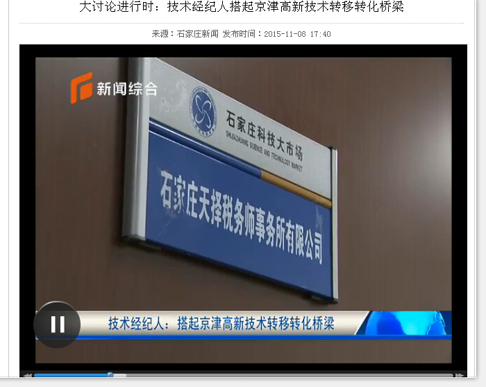 2015年11月7日,張勤董事長接受了石家莊電視臺采訪。今后,可以利用北京、天津、河北三地的科技資源,為供需雙方進行技術對接,使大量有錢沒有項目的企業(yè),有成果沒有資金的科研院所,通過技術對接尋找到適合自己需要的合作方,實現技術資源的優(yōu)化配置。