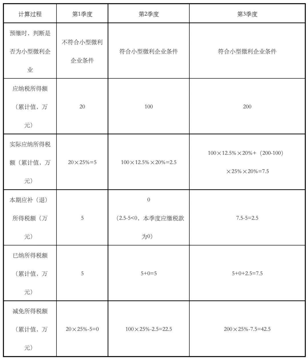 目前,小型微利企業(yè)的判斷標(biāo)準(zhǔn)為:從事國(guó)家非限制和禁止行業(yè),且同時(shí)符合截至本期末的資產(chǎn)總額季度平均值不超過5000萬(wàn)元、從業(yè)人數(shù)季度平均值不超過300人、應(yīng)納稅所得額不超過300萬(wàn)元。今后如調(diào)整標(biāo)準(zhǔn),從其規(guī)定,計(jì)算方法以此類推。示例如下: