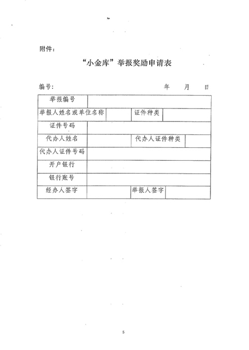 第八條 “小金庫”治理日常工作機(jī)構(gòu)根據(jù)舉報(bào)及查處情況,確定有功舉報(bào)人后,通知舉報(bào)人到指定地點(diǎn)辦理申請(qǐng)獎(jiǎng)勵(lì)手續(xù),查驗(yàn)舉報(bào)人身份證件或單位證明文件的原件,并留存復(fù)印件。登記用于領(lǐng)取獎(jiǎng)勵(lì)資金的銀行賬戶,填寫《舉報(bào)“小金庫”獎(jiǎng)勵(lì)申請(qǐng)表》。